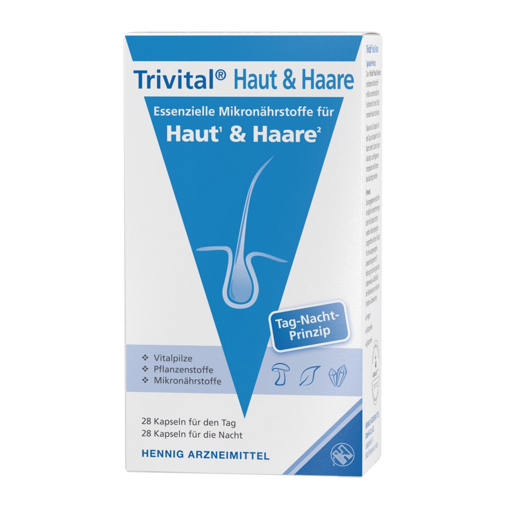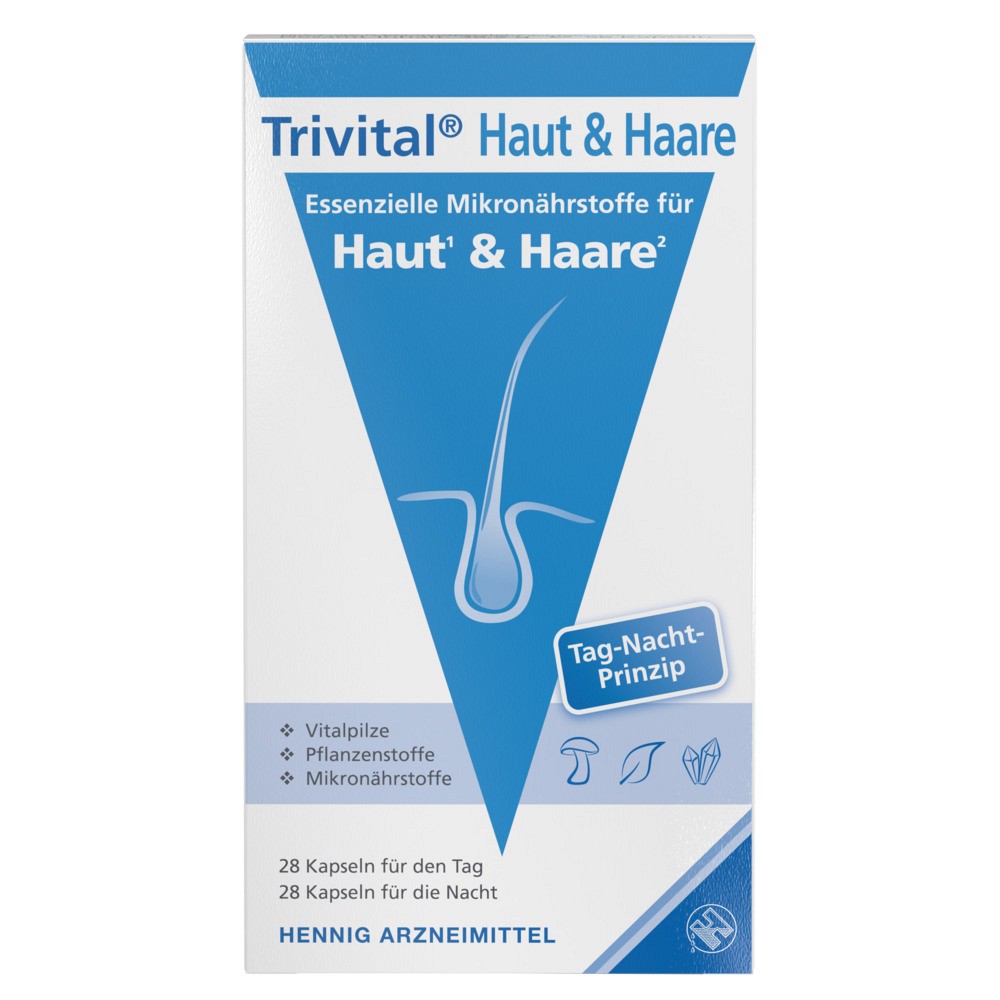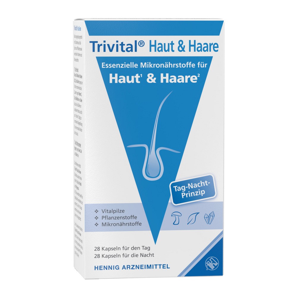 Trivital Haut & Haare von Hennig vereint in seinem einzigartigen Trivital Tri-Komplex die Kraft wertvoller Vitalpilze, ausgewählter Pflanzenstoffe und essenzieller Mikronährstoffe – abgestimmt auf den natürlichen Biorhythmus. Das innovative Tag-Nacht-Prinzip mit 2 unterschiedlichen Kapseln begleitet gezielt die Aktivitäts- und Erholungsphasen des Körpers.Was Trivital Haut & Haare so besonders macht: Die Verbindung von natürlichen Inhaltsstoffen wie Traubenkern-Extrakt und Rispenhirsekonzentrat mit den besonderen Vitalpilz-Extrakten von Reishi und Polyporus umbellatus aus nachhaltigem Anbau.