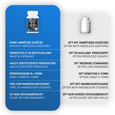 Nur Alpha-Liponsäure besitzt die Fähigkeit, sowohl in wasserlöslicher als auch in fettlöslicher Umgebung zu wirken. Dies bedeutet, dass R-Alpha-Liponsäure ihre Wirkung als Antioxidans an jedem Ort unseres Körpers entfalten kann. Natürliche Alpha-Liponsäure mit 200 mg pro Kapsel ist in der biologisch aktiven R(+) Form enthalten.Vorteile der hochdosierten Vitamaze R-Alpha-Liponsäure