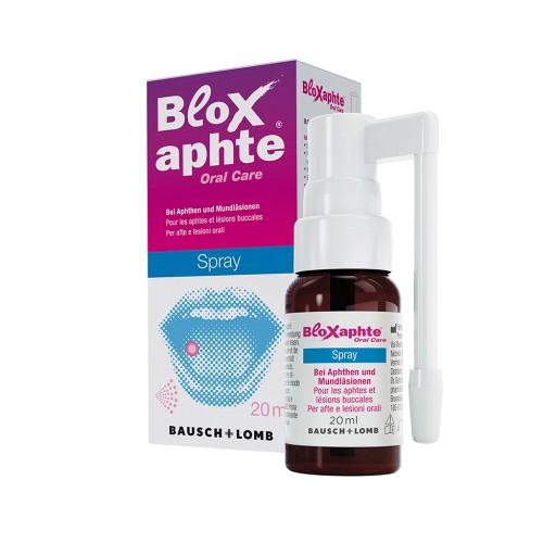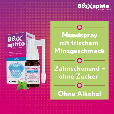 Gut für unterwegs und zur Behandlung von schwer zugänglichen LäsionenDas BloXaphte® Spray für Erwachsene eignet sich zur gezielten Behandlung von Aphthen und bei entzündlichen Verletzungen der Schleimhaut. Durch die Bildung eines Schutzfilms wird der Schmerz schnell gelindert und die Heilung der Aphthen gefördert. Das Spray mit Pfefferminz- Anis-Geschmack ist zuckerfrei und sanft zur Mundflora.