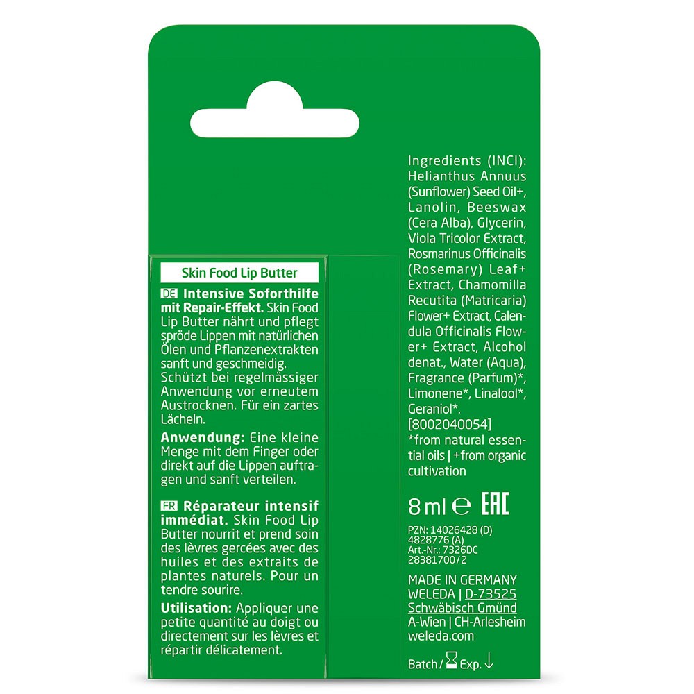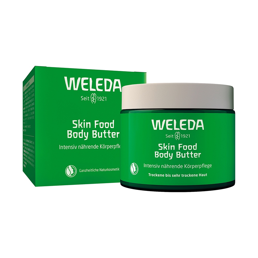 Die Weleda Skin Food Body Butter stillt den Durst trockener und rauer Hat und schenkt ihr lang anhaltende Feuchtigkeit. Die einzigartige Textur der Skin Food Body Butter verwandelt die tägliche Körperpflege in einen ganz besonderen Pflege-Moment: Die einzigartige Creme lässt sich wunderbar auf der Haut verteilen.Extrakte aus Stiefmütterchen, Calendula und Kamille beruhigen die Haut, während Bio-Shea- und Bio-Kakaobutter sie intensiv nähren. Für ein samtig-weiches Hautgefühl. Trockene und raue Haut wird wieder geschmeidig zart und mit wertvollen Pflanzenauszügen intensiv gepflegt.