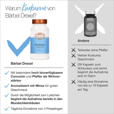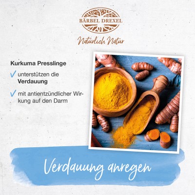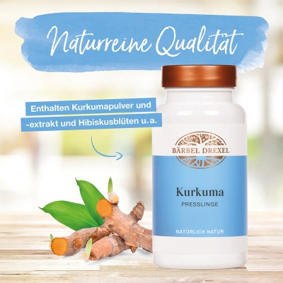 Bärbel Drexel Kurkuma Presslinge sind ein Nahrungsergänzungsmittel mit Kurkuma und einem hohen Gehalt an Vitamin C. Sie enthalten hauptsächlich Kurkumapulver und -extrakt mit besonders hoch bioverfügbarem Curcumin.
