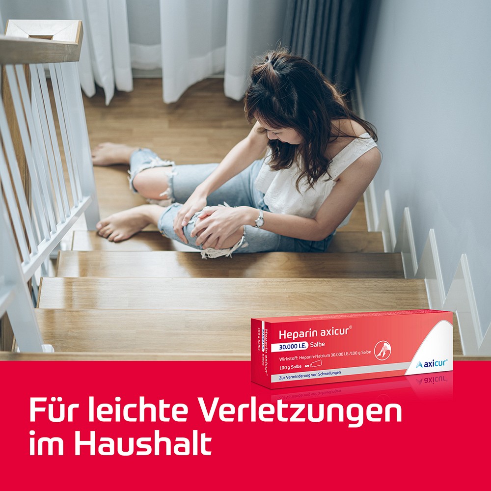 Prellungen und Blutergüsse (Hämatome) sind häufig auftretende stumpfe Verletzungen infolge z. B. eines leichten Sturzes oder nach starken Anstoßen an Gegenständen. Dies geht nicht nur mit Schmerzen einher, sondern wird meist von Schwellungen an der betroffenen Stelle begleitet. Eine Schwellung ist eine stumpfe Verschlussverletzung, die durch ein Blutgerinnsel oder Stoffwechselprodukten verursacht wird, welche sich aufgrund von äußerem Druck im Gewebe aufbauen.Heparin axicur 30.000 I.E. Salbe ist ein bewährter Helfer, um Schwellungen infolge von Prellungen und Blutergüssen zu mildern. Die Salbe wird örtlich auf die betroffene Hautpartie aufgetragen und kann dort gezielt für Abschwellung sorgen.