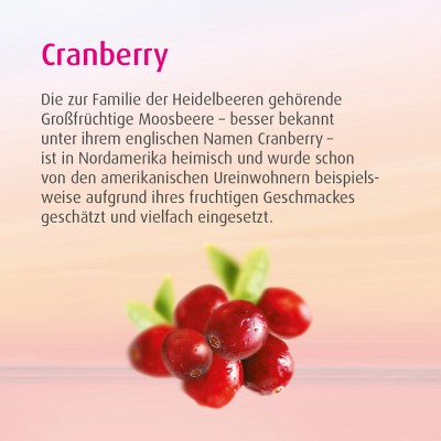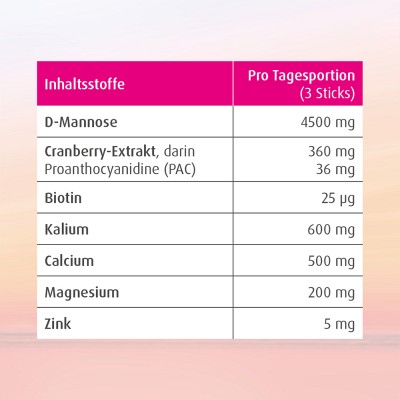Neben 4,5 g aus der Birke gewonnene D-Mannose enthält sie das wasserlösliche Vitamin Biotin, einen Zink-Mineralstoff-Komplex sowie Cranberry-Extrakt, der aufgrund seiner sekundären Pflanzenstoffe (Proanthocyanidine, kurz PAC) besonders geschätzt wird.