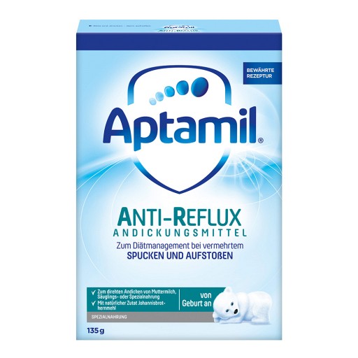 Aptamil AR Andickungsmittel bei Spucken &. Aufstoßen, 135g als Pulver ist speziell für Babys geeignet, die deutlich mehr als üblich spucken und aufstoßen.Aptamil AR enthält den natürlichen Quellstoff Johannisbrotkernmehl, welcher die Nahrung besonders sämig macht. Dadurch bleibt die Nahrung besser im Magen und vermindert so den Rückfluss in die Speiseröhre (Reflux).