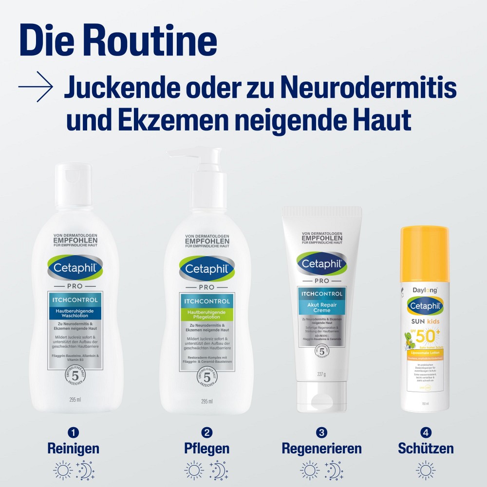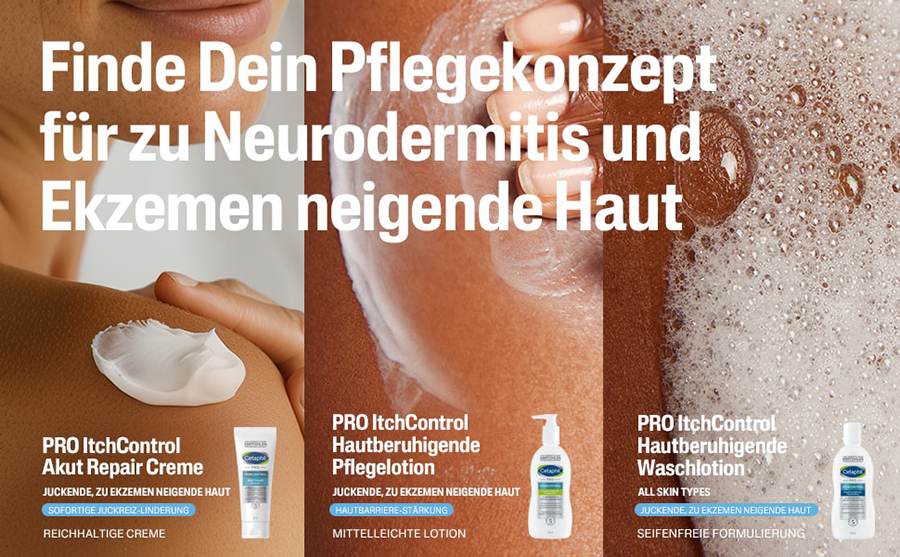 Mit dem Duo aus Cetaphil PRO ItchControl Hautberuhigende Waschlotion und der Cetaphil PRO ItchControl Hautberuhigenden Pflegelotion haben wir ein speziell aufeinander abgestimmtes Reinigungs- und Pflegekonzept für Neurodermitiker entwickelt. Die kombinierte Anwendung der Wasch- und Pflegelotion hilft die schubfreien Phasen bei Neurodermitis zu verlängern sowie den Einsatz topischer Corticosteroide zu verringern3. Die ausgezeichnete Pflegewirkung und Verträglichkeit bei Neurodermitis sind dermatologisch bestätigt.