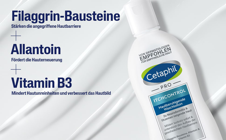 • Gezielt pflegen: Durch eine konsequente 2 x tägliche Pflege können der Haut die Stoffe zugeführt werden, die ihr genetisch bedingt fehlen. Die wertvollen Filaggrin- und Ceramid-Bausteine der Cetaphil PRO ItchControl Hautberuhigenden Pflegelotion stärken die Barrierefunktion gezielt und versorgen gleichzeitig mit dringend benötigter Feuchtigkeit.