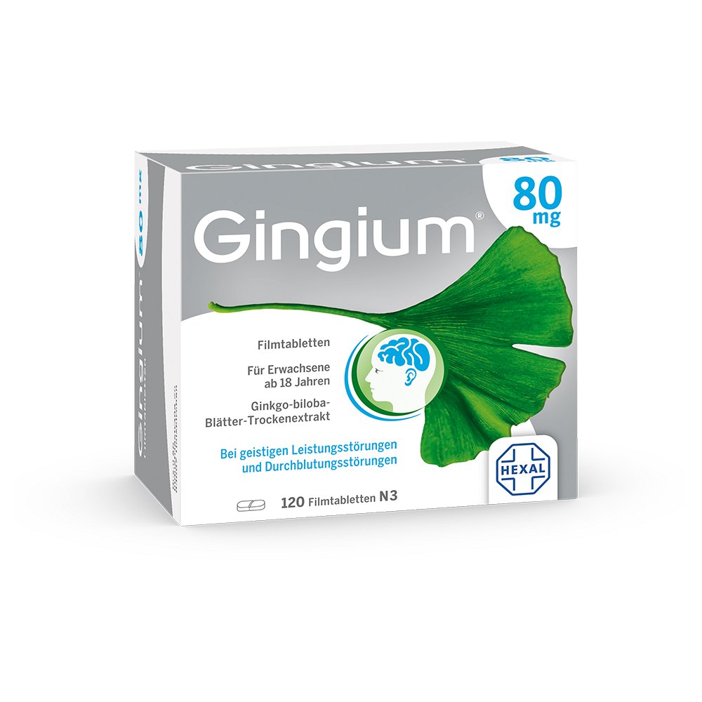 Damit das Gehirn seinen vielfältigen Aufgaben gut nachkommen kann, braucht es ausreichend Nährstoffe und Sauerstoff. Gingium® 80 mg hilft dabei, indem es die Durchblutung im Gehirn fördert und dadurch Gedächtnis und Konzentration verbessert.aZudem kann Gingium® 80 mg durch die bessere Durchblutung auch die Regeneration des Innenohrs bei Tinnitusb unterstützen. Der hochwertige Spezialextrakt wird aus den Blättern des Ginkgo-Baumes gewonnen, weist eine hohe Konzentration natürlicher Wirkstoffe (Flavonglykoside, Terpenlactone) auf und ist gut verträglich.