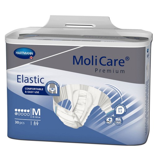 Moderner Inkontinenz-Slip mit 3-lagigem, anatomisch geformtem und geruchsbindendem Saugkern, mit antibakterieller, pH-hautneutraler quick-dry Verteilerauflage, flüssigkeitsabweisenden, weichen Innenbündchen, elastischem Beinabschluss, textilem Backsheet, Nässeindikator, atmungsaktiven Vliesseitenteilen im Hüftbereich und zwei breiten wiederverschließbaren Klett-Klebeverschlüssen. Durch einen speziell entwickelten Saugkörper bietet MoliCare® Premium Elastic bestmöglichen Rundum-Schutz, eine hohe Saugkraft und Speicherleistung. MoliCare® Premium Elastic ist dermatologisch getestet, schützt vor Rücknässung, unterstützt die Gesunderhaltung der Haut und bietet angenehmen Tragekomfort. Die dehnbaren Seitenteile und breiten Klett-Klebeverschlüsse machen die MoliCare® Premium Elastic äußerst anwenderfreundlich.