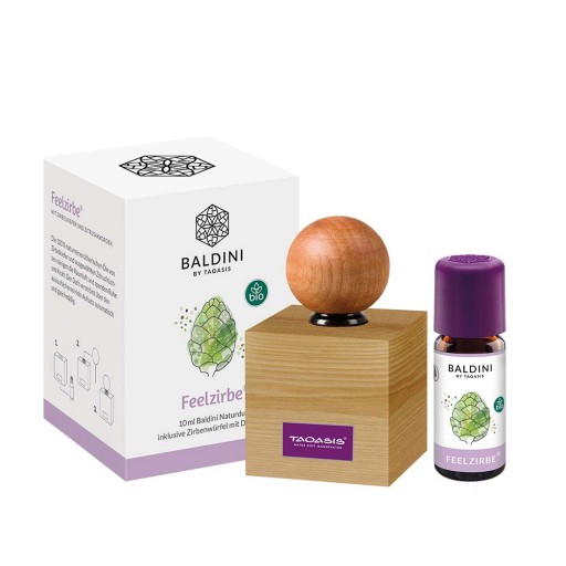 Das Set besteht aus 10ml Feelzirbe Naturduft und einem Holzwürfel (50mm) aus Zirbe