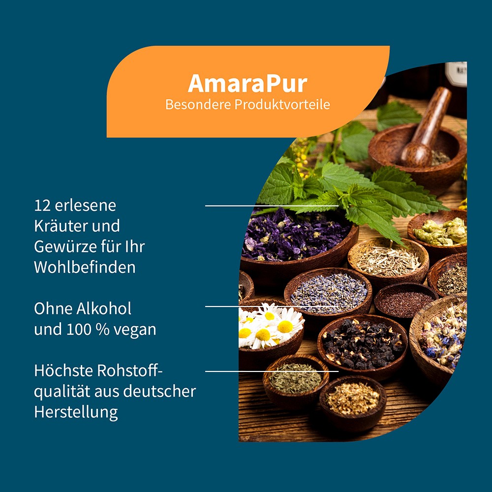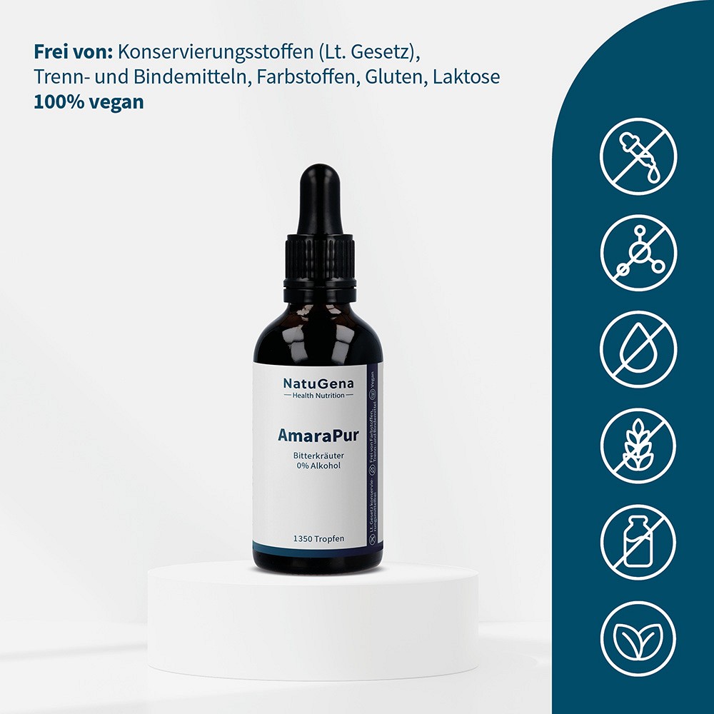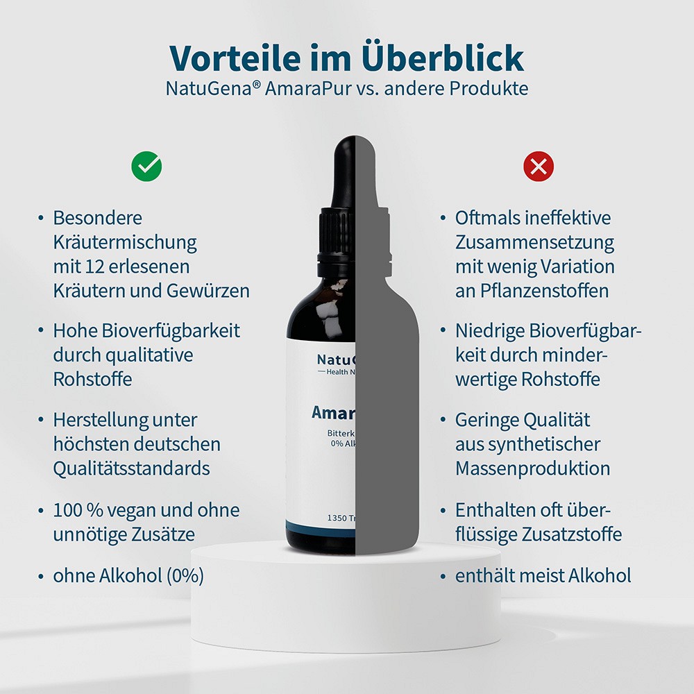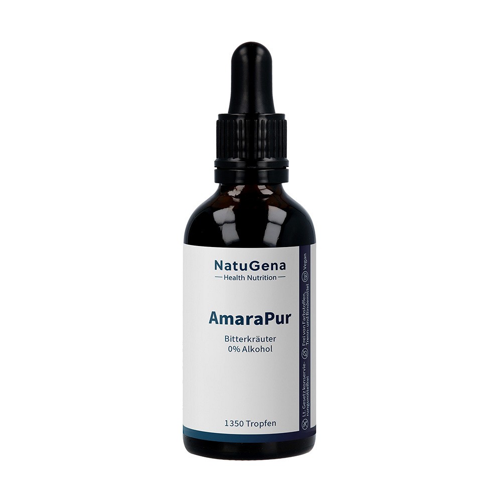 NatuGena AmaraPur vereint 12 ausgewählte Pflanzenstoffe, die von Natur aus reich an Bitterstoffen und sekundären Pflanzenstoffen sind. Die fein abgestimmte Mischung enthält Kräuter, Wurzeln, Blätter, Blüten und Rinden – in ihrer natürlichen Form und ohne künstliche Zusätze.