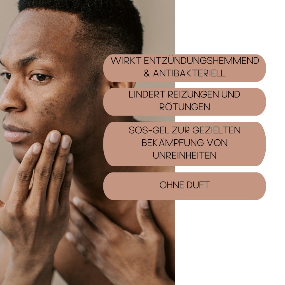 Das SOS-Gel bekämpft gezielt Unreinheiten und Entzündungen. Zink, Salicylsäure aus Weidenrinde und Stiefmütterchenblütenextrakt wirken intensiv entzündungshemmend, antibakteriell und unterstützen die Abheilung.