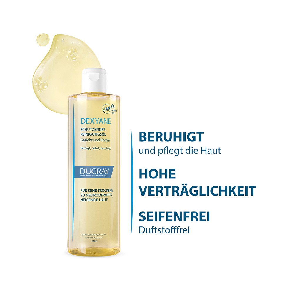 DEXYANE Schützendes Reinigungsöl von DUCRAY beruhigt und nährt die Haut und reduziert die bakterielle Ausbreitung. Die Haut wird sanft gereinigt und vor Hauttrockenheit geschützt.Das Reinigungsöl ist ohne Duftstoffe und bereits ab Geburt anwendbar. Die sanfte Reinigungsbasis mit hochverträglichem, physiologischem PH-Wert wurde entwickelt, um das Risiko von allergischen Reaktionen zu minimieren. Seifenfrei und parfümfrei.