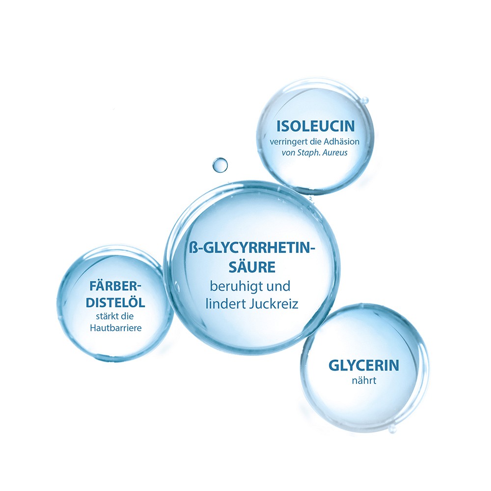 Das Reinigungsöl besteht aus den Aktivstoffen Glycerin (20%) und Karitébutter. Diese sind bekannt für ihre feuchtigkeitsspendenden und pflegenden Eigenschaften. Isoleucin limitiert die bakterielle Adhäsion, insbesondere von S. aureus (Staphylococcus aureus). ß-Glycyrrhetinsäure ist ein hautberuhigender Aktivstoff.Anwendung: