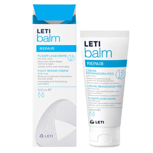 LETI balm Fußpflegecreme repariert und pflegt besonders raue und trockene Hautpartien an Füßen, Knien und Ellenbogen. Die Creme beseitigt nicht nur zuverlässig starke Verhornungen und Risse. Sie unterstützt auch die Reparatur der geschädigten Hautbarriere und bringt sie wieder ins Gleichgewicht.