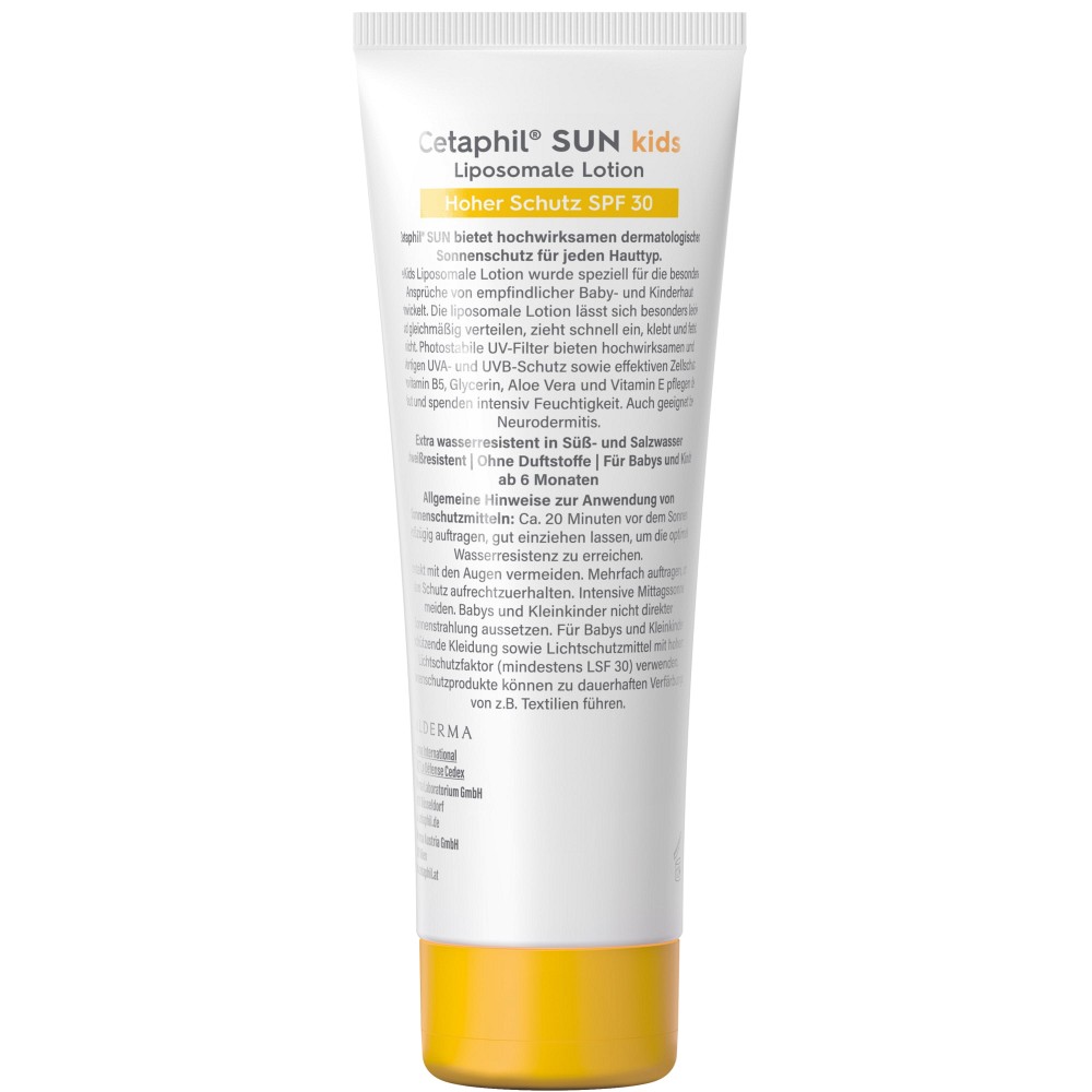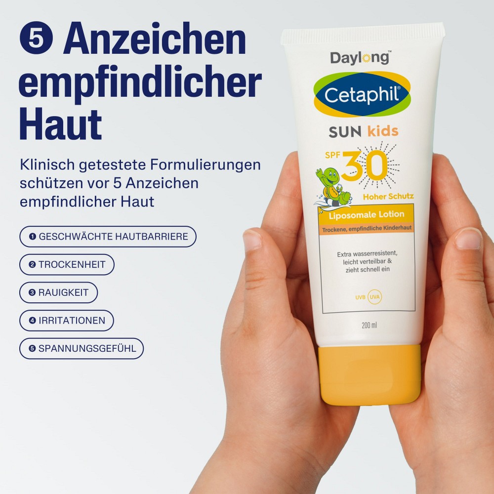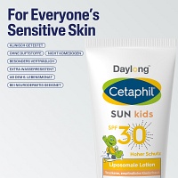 Cetaphil Sun Daylong Kids Liposomale Lotion SPF 30 ist ein dermatologischer Sonnenschutz speziell für die besonderen Ansprüche von empfindlicher Baby- und Kinderhaut (auch bei Neurodermitis geeignet). Die photostabilen UV-Filter bieten einen hochwirksamen und sofortigen UVA- und UVB-Schutz und beugen sonnenbedingten Hautschäden1 vor. Die Sonnencreme mit hohem Lichtschutzfaktor ist frei von Duftstoffen und extra wasserfest in Süß- und Salzwasser. Dank ihrer liposomalen Eigenschaften zieht sie schnell ein, klebt nicht und ist leicht verteilbar. 98% der Konsumenten empfehlen Cetaphil Sun Daylong Kids weiter.2