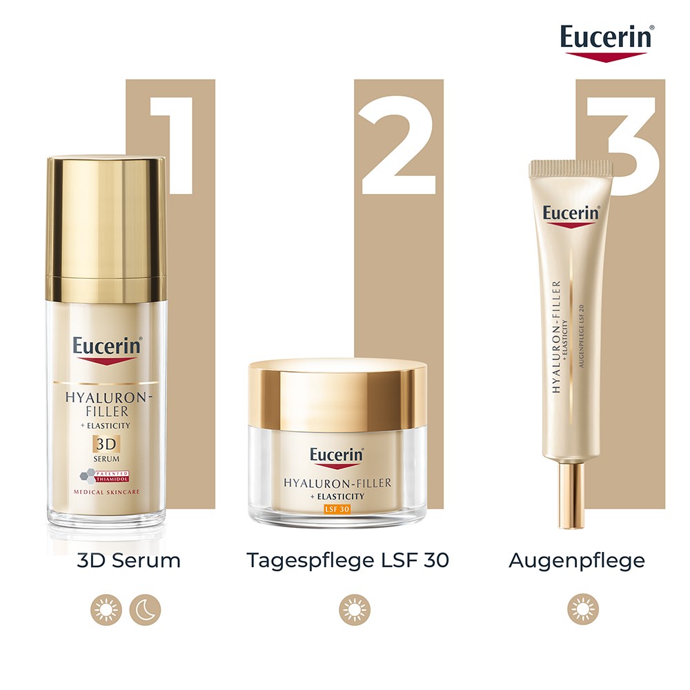 Die speziell für reife Haut entwickelte Eucerin Hyaluron-Filler + Elasticity Augenpflege verbessert die Elastizität sichtbar und trägt zur Milderung selbst ausgeprägter Falten bei. Hierfür bindet die Anti-Falten Creme die Feuchtigkeit mit ihrer innovativen, einzigartigen Formel mit kurz- und langkettiger Hyaluronsäure.