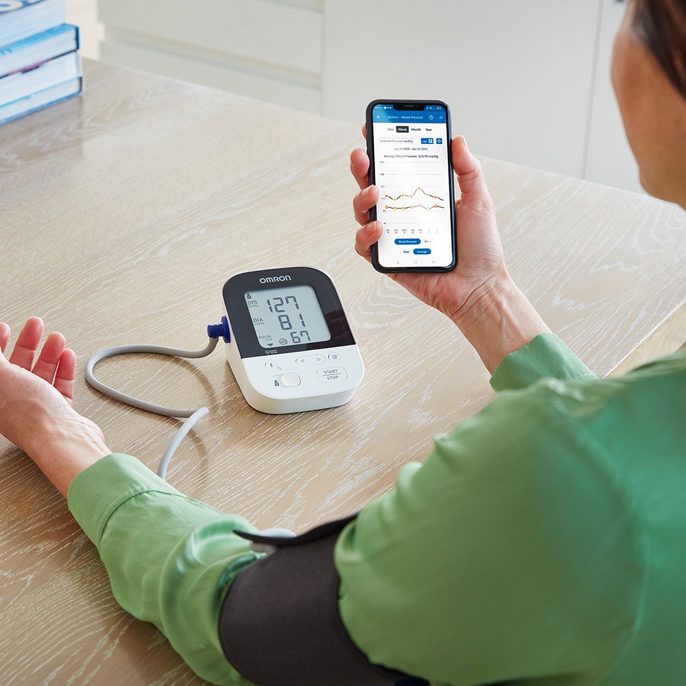 Das Gerät übermittelt die neuesten Messergebnisse per Bluetooth automatisch an Ihr Smartphone, sodass Sie Ihre Blutdruckwerte in der App OMRON connect jederzeit ablesen können – oder Sie lassen sich die Werte einfach von Alexa vorlesen, ohne das Smartphone zur Hand nehmen zu müssen.OMRON connect, die von der Deutschen Hochdruckliga e.V. als "Digitaler Gesundheitshelfer" zertifizierte App für iOS/Android.