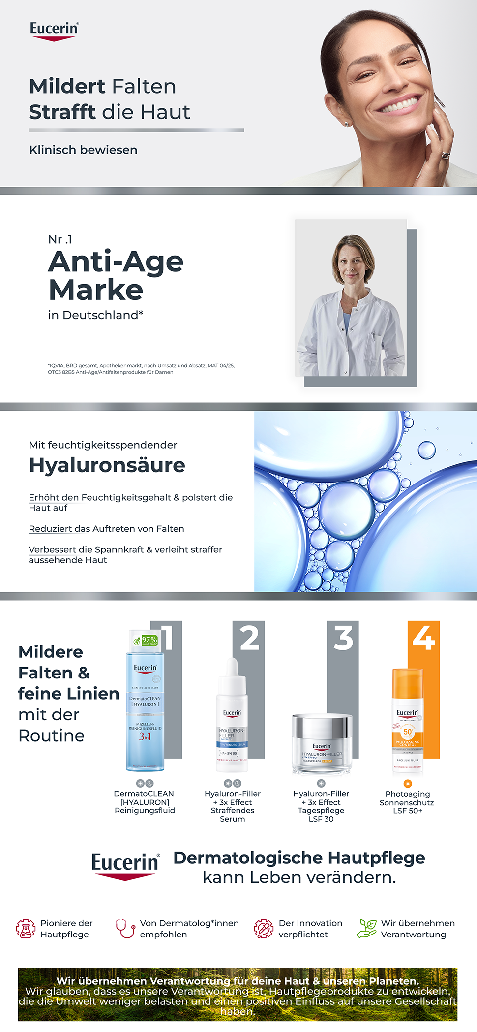 Die Eucerin Hyaluron-Filler + 3x Effect Hyaluron-Intensiv-Maske ist eine erfrischende Tuchmaske zur intensiven Feuchtigkeitsversorgung und einen strahlenden Teint. In nur 5 Minuten spendet sie der Haut neue Frische und reduziert feine Fältchen sichtbar. Die innovative Formel mit hochkonzentrierter Hyaluronsäure ist für alle Hauttypen geeignet – auch bei empfindlicher Haut.Das biologisch abbaubare Tuch der Pflegemaske aus natürlichem Material passt sich der Gesichtskontur optimal an und sorgt für ein angenehm kühlendes Pflegeerlebnis. Klinische und dermatologische Studien beweisen, dass die Hautpflege eine sehr gute Hautverträglichkeit und Wirksamkeit aufweist.
