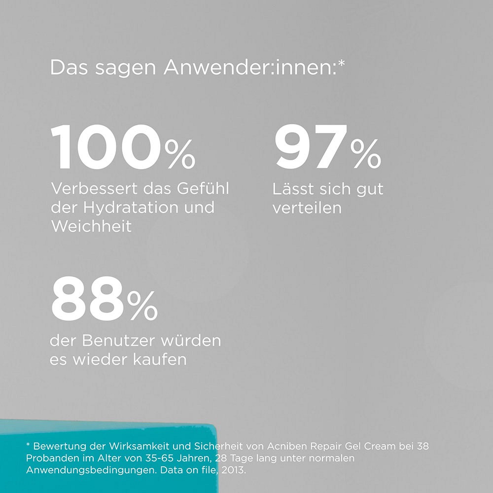 ¹ Bewertung der Wirksamkeit und Sicherheit der Acniben Repair Gel-Creme bei 38 Probanden im Alter zwischen 35 und 65 Jahren über 28 Tage unter normalen Anwendungsbedingungen. Archivierte Daten, 2013.