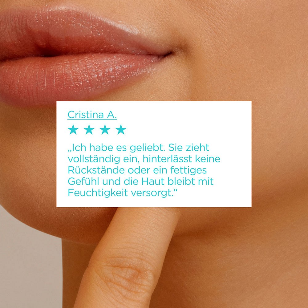 Die beruhigende Feuchtigkeitspflege zieht schnell ein und hinterlässt keine fettigen Rückstände.
