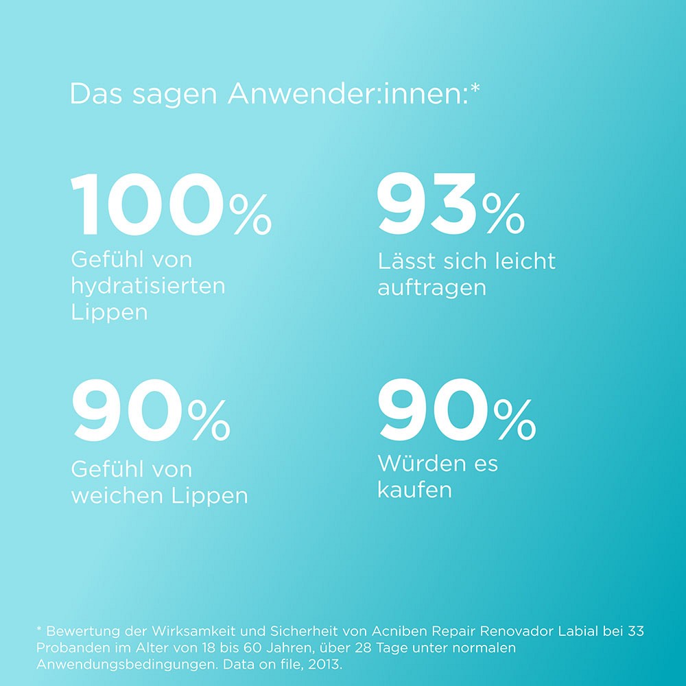 ¹ Bewertung der Wirksamkeit und Sicherheit der Lippenerneuerung Acniben Repair bei 33 Probanden im Alter von 18 bis 60 Jahren über 28 Tage unter normalen Anwendungsbedingungen. Archivierte Daten, 2013.