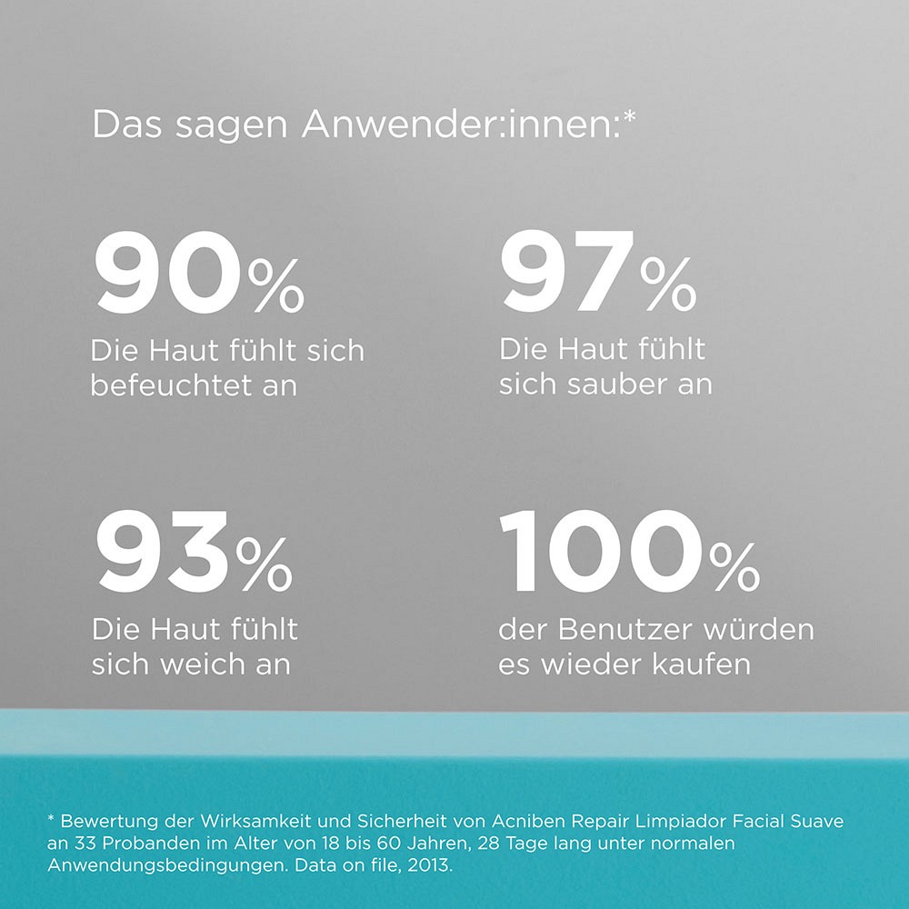 ¹ Bewertung der Wirksamkeit und Sicherheit des sanften Gesichtsreinigers Acniben Repair bei 33 Probanden im Alter zwischen 18 und 60 Jahren über 28 Tage unter normalen Anwendungsbedingungen. Archivierte Daten, 2013.