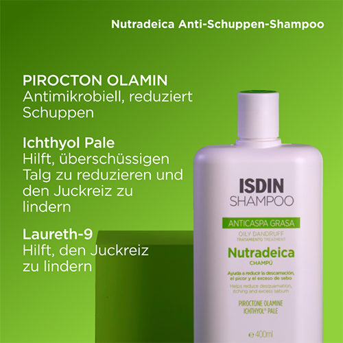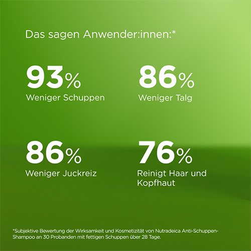 Schuppen entstehen durch einen Überschuss an Fett und Talg auf der Kopfhaut, der dazu führt, dass sich die Haut ansammelt und dann abblättert. Nutradeica® Anti-Schuppen-Shampoo reduziert Schuppen schon bei der ersten Anwendung.Nutradeica® Anti-Schuppen-Shampoo für fettiges Haar lindert den durch Schuppen verursachten Juckreiz und macht das Haar weich, glänzend und versorgt es mit Feuchtigkeit.
