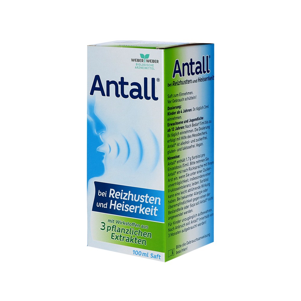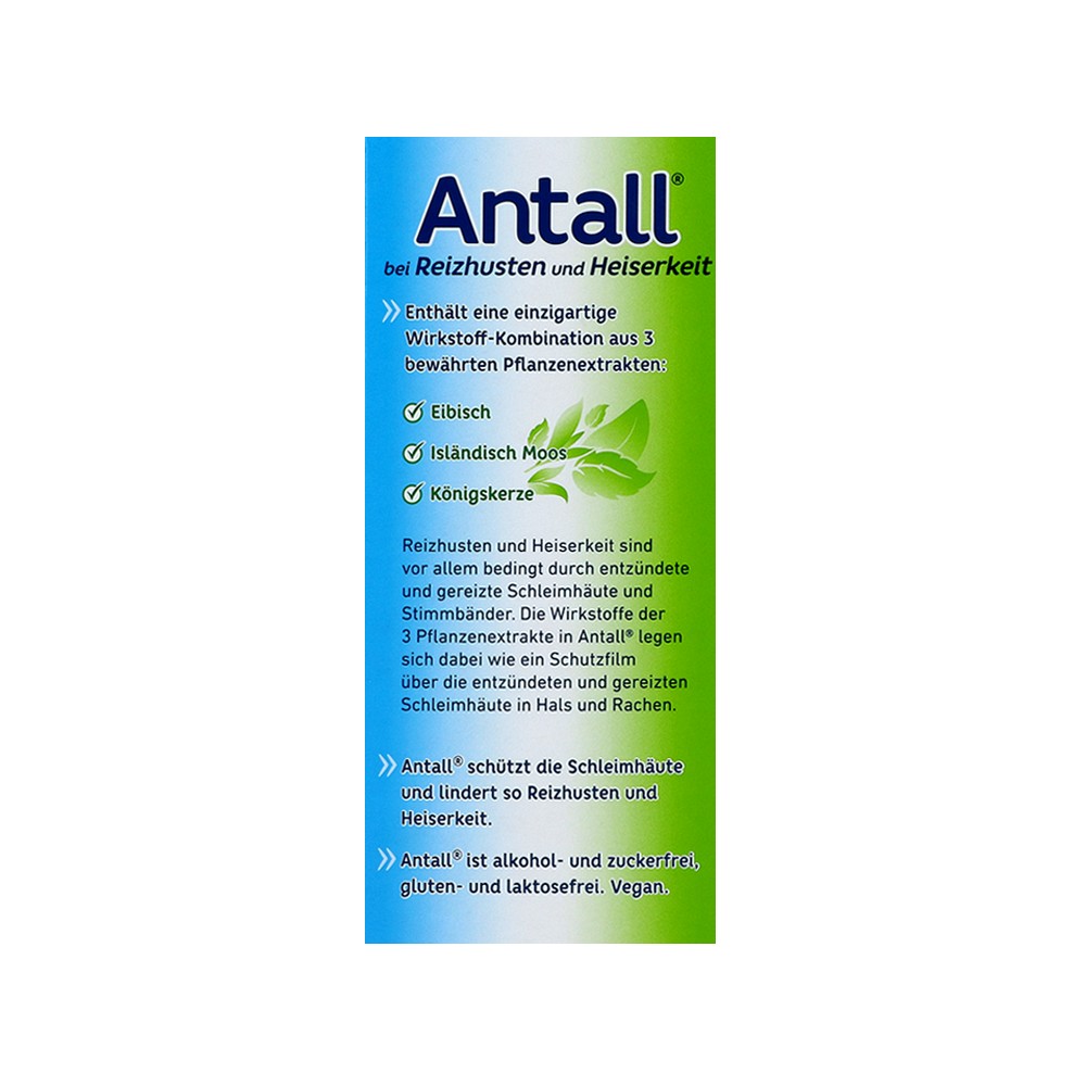 Reizhusten und Heiserkeit sind vor allem bedingt durch entzündete und gereizte Schleimhäute und Stimmbänder. Die Wirkstoffe der 3 Pflanzenextrakte in Antall® legen sich dabei wie ein Schutzfilm über die entzündeten und gereizten Schleimhäute in Hals und Rachen und lindern so Reizhusten und Heiserkeit.