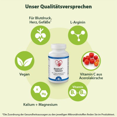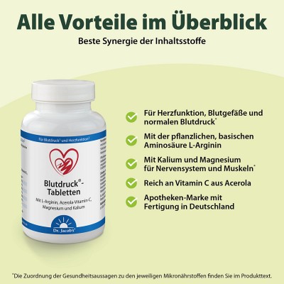 Nicht nur eine gesunde Ernährungs- und Lebensweise kann den Blutdruck positiv beeinflussen. Mit der Einnahme von Mikronährstoffen in der richtigen Kombination können Sie Ihren Blutdruck zusätzlich sinnvoll unterstützen.Dr. Jacob’s Blutdruck-Tabletten orientieren sich an einer pflanzenbetonten Ernährungsweise – mit ausgewählten Vitaminen, optimal aufeinander abgestimmten Mineralstoffen sowie L-Arginin, das aus Pflanzen hergestellt wird.