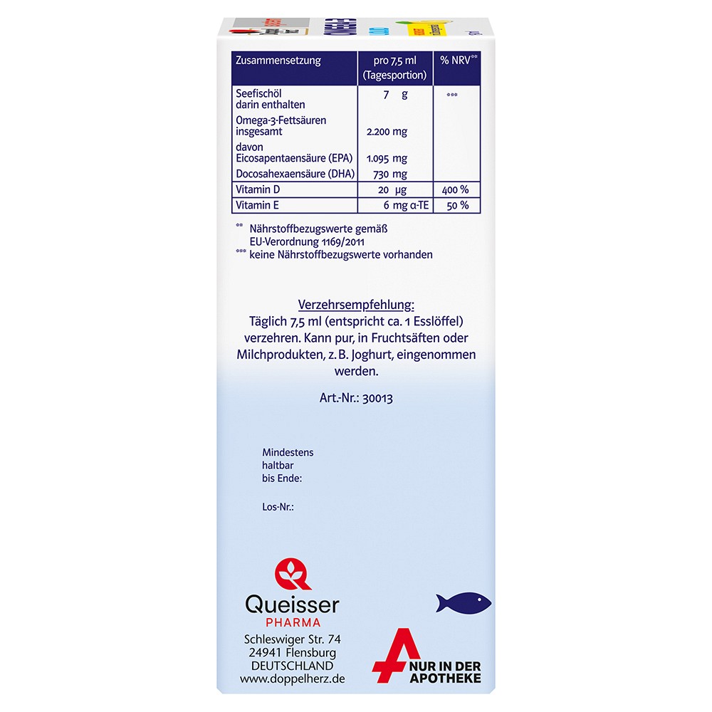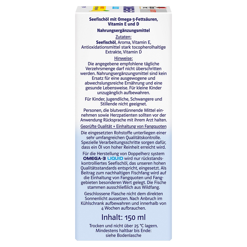 Doppelherz system Omega-3 Liquid liefert pro Tagesmenge 2.000 mg Omega-3-Fettsäuren aus wertvollem Seefischöl in Kombination mit 20 µg Vitamin D3 und 6 mg Vitamin E. Die Omega-3-Fettsäuren EPA/DHA tragen bei einer täglichen Aufnahme von 250 mg zur normalen Herzfunktion bei.