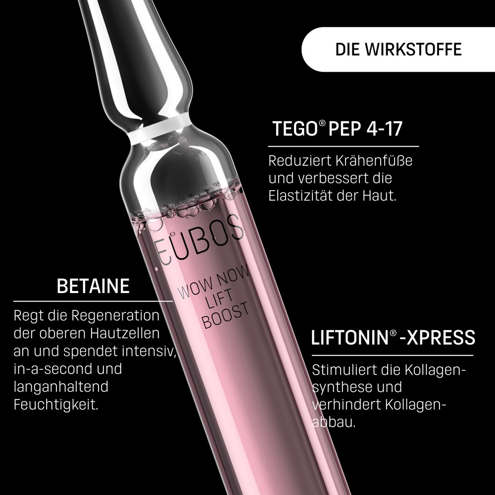 Glatt und straff im Handumdrehen: Die WOW NOW LIFT BOOST-Kur sorgt blitzschnell für den Wow-Effekt. Betain, Peptide und Hyaluronsäuren arbeiten hier zusammen mit Liftonin®-Xpress, dem neuen Instant-Lifting-Star.EFFEKT