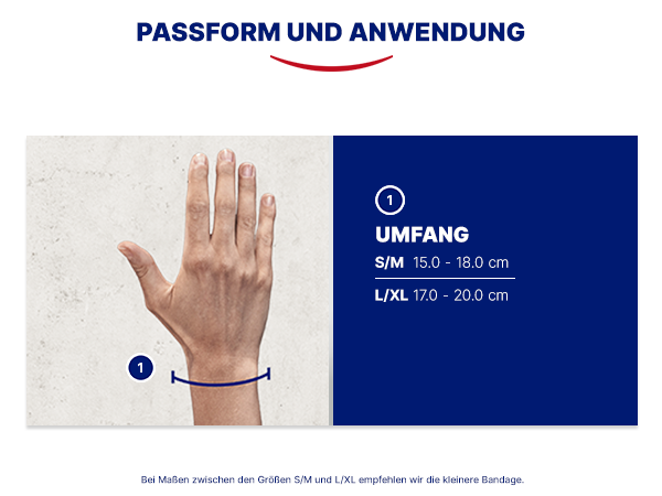 Bei Maßen zwischen den Größen S/M und L/XL empfehlen wir die kleinere Handgelenkbandage.