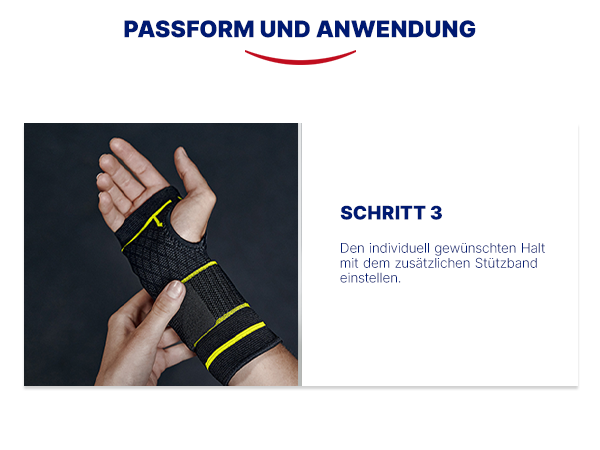 Schritt 3: Die Bandage hochziehen und mit dem zusätzlichen Stützband den individuell gewünschten Halt einstellen.