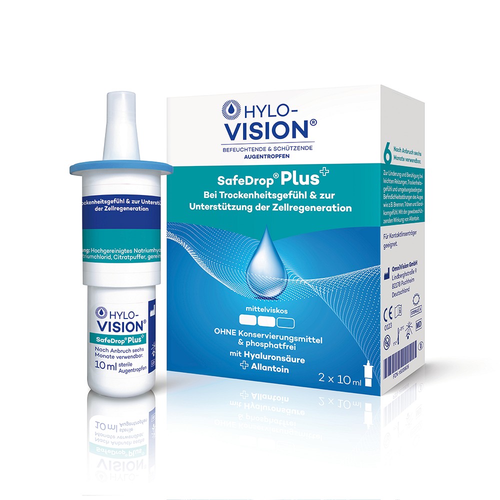 HYLO-VISION SafeDrop Plus dient der verbesserten und langanhaltenden Befeuchtung und dem Schutz der Augenoberfläche. Die Augentropfen enthalten 0,2 % Hyaluronsäure – eine natürliche Substanz, die auch in Strukturen des menschlichen Auges und im Tränenfilm vorkommt und deshalb besonders gut verträglich ist.Hyaluronsäure zeichnet sich durch ein hohes Wasserbindungsvermögen aus. Dank mucoadhäsiver Eigenschaften haftet sie gut auf der Augenoberfläche. Damit befeuchtet und schützt HYLO-VISION SafeDrop Plus die Oberfläche der Augen und sorgt für einen gleichmäßigen, stabilen und besonders lang haftenden Feuchtigkeitsfilm.