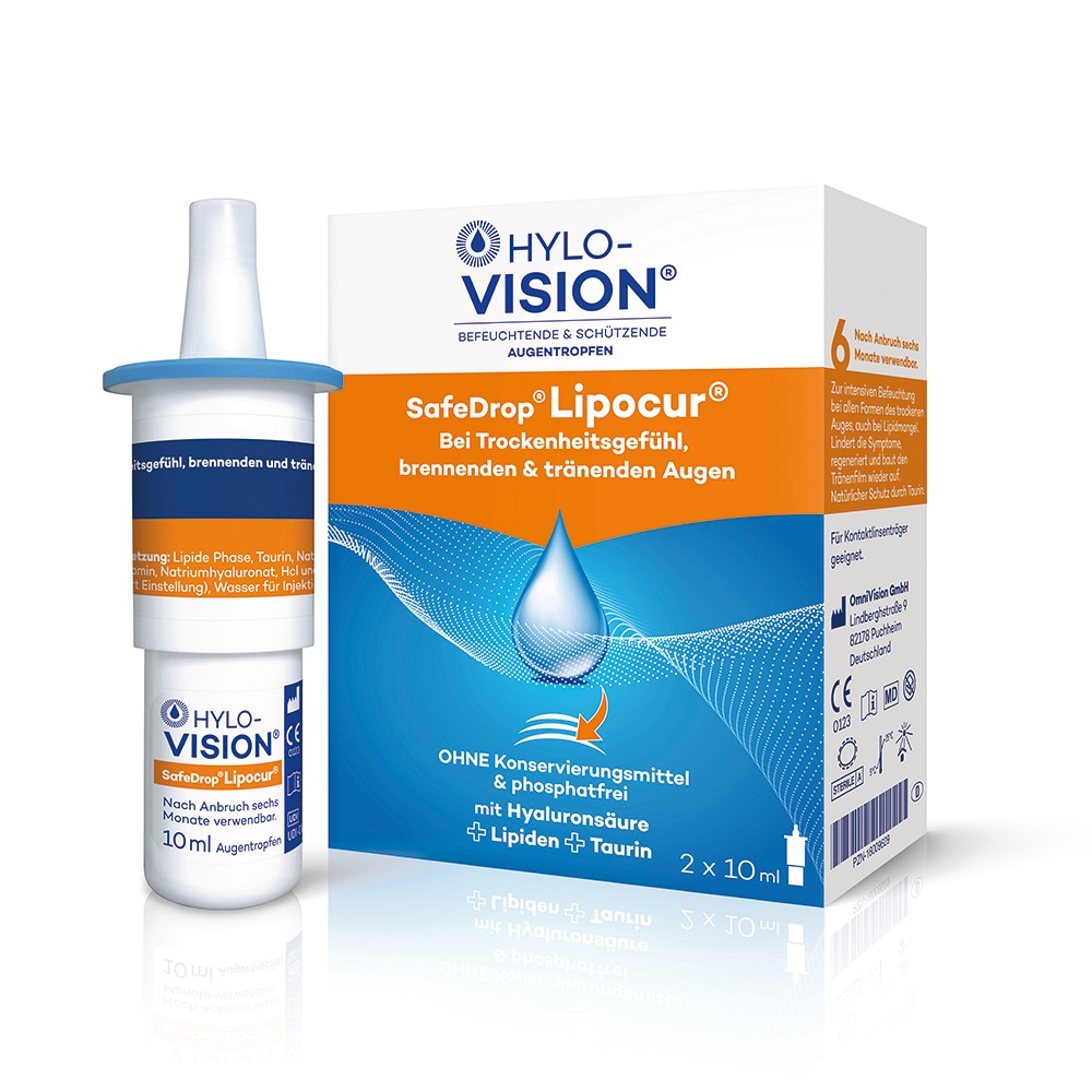 Sehstress und Umweltreize, eine mechanische Beanspruchung der Augen durch Kontaktlinsen und Operationen sowie verschiedene Erkrankungen und Medikamente können unangenehme Symptome wie ein Trockenheitsgefühl, brennende und tränende Augen hervorrufen.HYLO-VISION SafeDrop Lipocur mit Feuchtigkeitsspendern, Lipiden und Taurin sorgt für eine intensive Befeuchtung bei allen Formen des Trockenen Auges, auch bei Lipidmangel. Die Augentropfen lindern die Symptome, regenerieren und bauen den Tränenfilm wieder auf.
