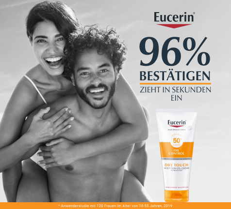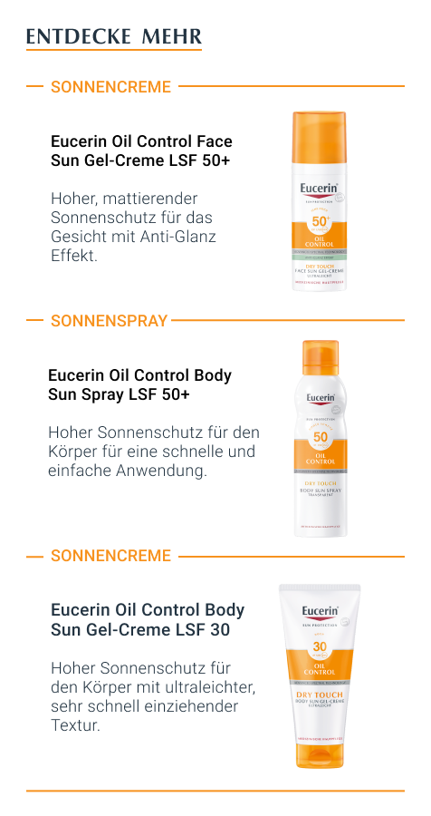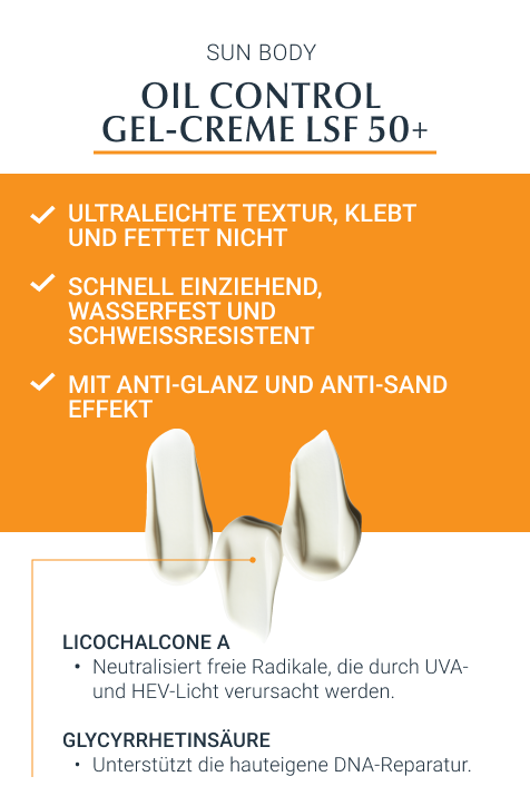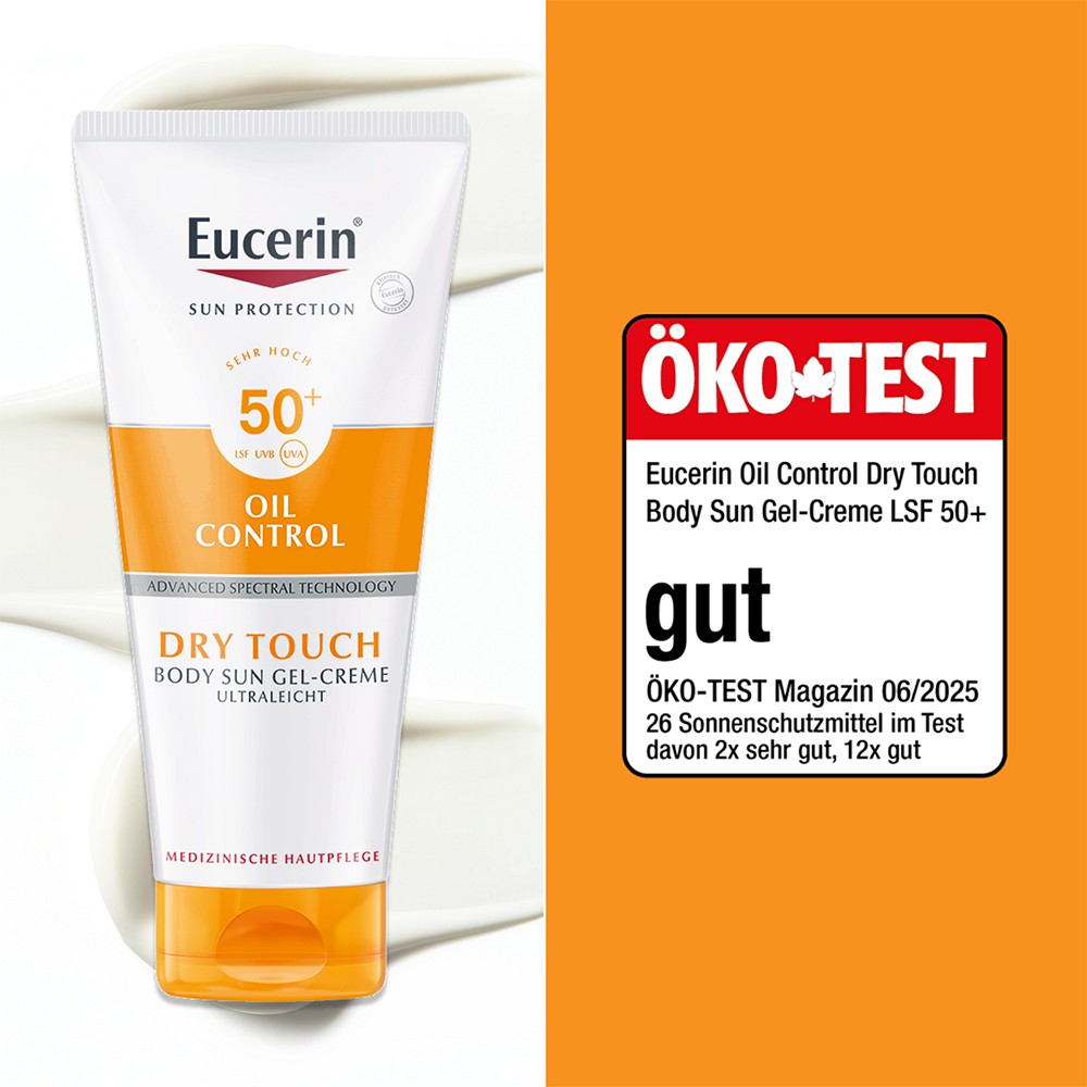 Die Eucerin Oil Control Body Sun Gel-Creme mit Lichtschutzfaktor 50+ bietet dem gesamten Körper hohen Schutz vor sonnenbedingten Schäden der Haut. Dank der sehr leichten Textur kann das Sonnen Gel in nur wenigen Sekunden einziehen. Dabei hinterlässt es keine Rückstände auf der Haut und fettet nicht. Zusätzlich bewirkt die innovative Oil Control Technology mit mattierenden Pigmenten einen dauerhaften und sofortigen Anti-Glanz Effekt.Die schnelle und unkomplizierte Anwendung sorgt für einen optimalen Schutz der Haut. Darüber hinaus ist die Sonnen Creme wasserfest und schweißbeständig und mit dem Anti-Sand Effekt eignet sie sich perfekt für sportliche Aktivitäten oder am Strand.