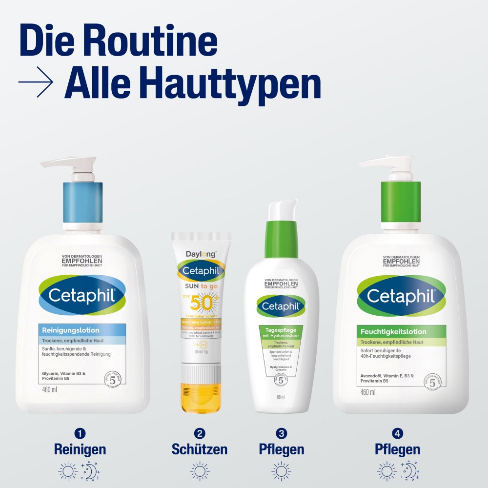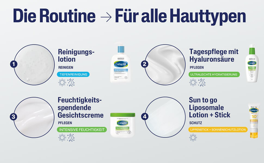 UVA-Strahlung lässt die Haut altern, fördert die Bildung von Falten sowie Altersflecken und kann allergische Hautreaktionen, wie Sonnenallergie oder Mallorca-Akne hervorrufen. UVB-Strahlung hingegen verursacht Sonnenbrand sowie Schäden im Erbgut unserer Hautzellen. Beide Strahlungsarten können Auslöser von Hautkrebs sein. Sonnenschutzmittel, wie die von Cetaphil Sun Daylong, sind ein wichtiger Bestandteil zur gesundheitlichen Vorbeugung von Hautkrebs. UV-Filter bieten hierbei einen hochwirksamen und sofortigen UVA- und UVB-Schutz, effektiven Zellschutz4 und beugen sonnenbedingte Hautalterung vor4.