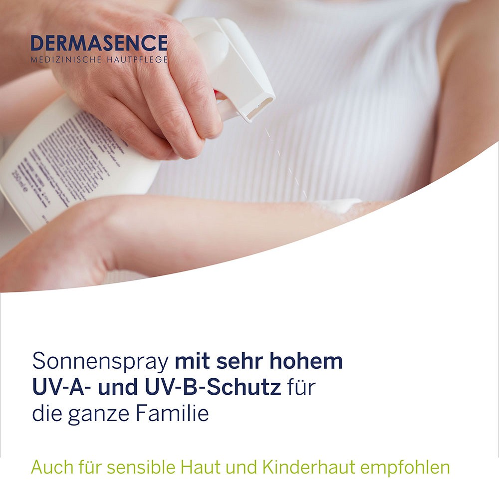 Sonnenschutz für die ganze Familie, speziell für sensible Haut und Kinder geeignet. Schützt auch in den tieferen Hautschichten. Als Spray schnell und einfach aufzutragen.Zur Reinigung der Haut empfehlen wir DERMASENCE Wasch- und Duschlotion. Als After Sun-Pflege empfehlen wir DERMASENCE Aloe Vera Active Gel mit hochkonzentriertem Aloe-vera-Extrakt.