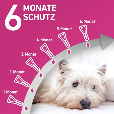 Die vordosierte Pipette aus der Verpackung nehmen und die Spitze der Pipette mit einer Schere abschneiden. Das Fell des Hundes an zwei Stellen im Nacken scheiteln und die Pipette zunächst an der ersten, dann an der zweiten Stelle direkt auf der Haut je zur Hälfte entleeren.Schon fertig – von den Auftragsstellen aus verteilt sich der Wirkstoff nun wie ein unsichtbarer Schutzfilm innerhalb von ein bis zwei Tagen auf der gesamten Haut.