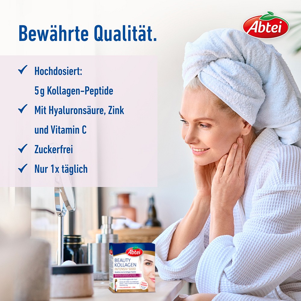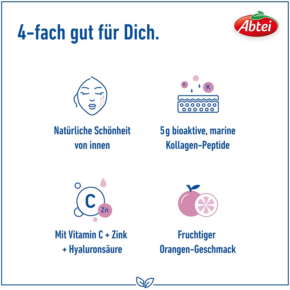 Kollagen ist ein wichtiger Strukturbestandteil der Haut und des Bindegewebes. Mit zunehmendem Alter nimmt die Kollagenproduktion ab, die Haut verliert an Spannung und Elastizität und neigt zur Faltenbildung. Abtei Beauty Kollagen Intensiv 5000 kombiniert hochdosierte, bioaktive marine Kollagen-Peptide mit Hyaluronsäure, Vitamin C und Zink. Die besondere Formel sorgt für natürliche Schönheit von innen und trägt zur Erhaltung gesunder Haut, Haare und Nägel bei.
