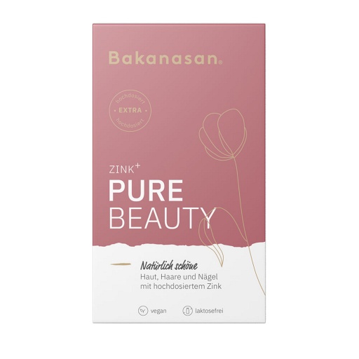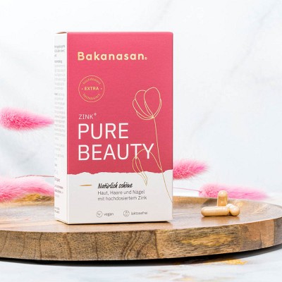 Unsere Haut, Haare und Nägel sind der Spiegel unserer Lebensgewohnheiten. Glänzendes Haar, gesunde Haut und kräftige Nägel sind das Ergebnis innerer Prozesse. Für ein attraktives Erscheinungsbild ist eine tägliche Pflege und eine ausgewogene Versorgung mit Vitaminen und Mineralstoffen wichtig.Bakanasan Pure Beauty ergänzt die tägliche Schönheitspflege mit Zink, Biotin, Vitamin C und E ganz natürlich von innen. Für die Gesundheit der Haut und Haare leistet Zink, ebenso wie Biotin, einen wesentlichen Beitrag. Beide Nährstoffe tragen zum Erhalt normaler Haut und Haare bei und unterstützen eine frische Ausstrahlung. Auch für den Erhalt normaler Nägel spielt Zink eine wichtige Rolle, da es das natürliche Wachstum von innen unterstützt.
