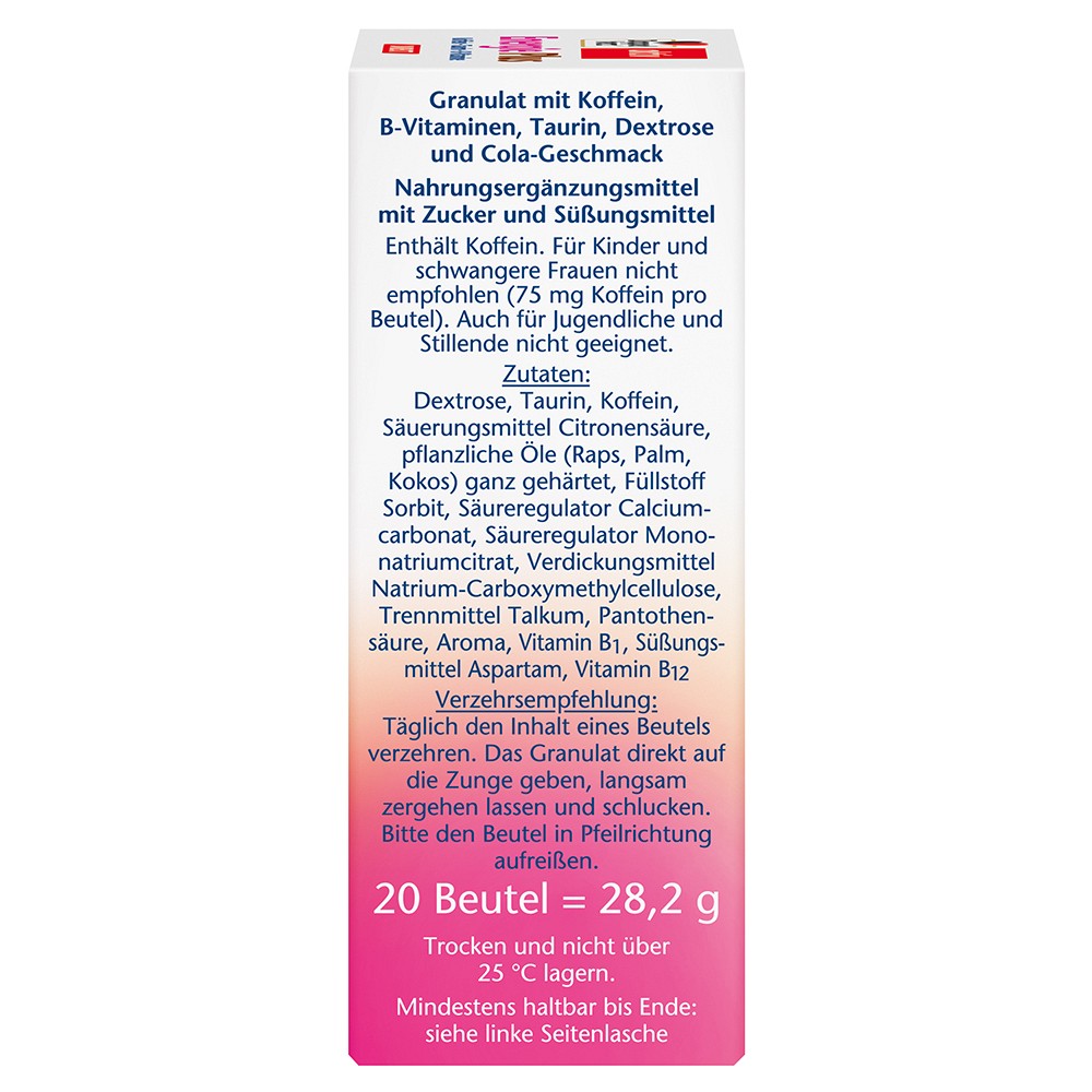 Doppelherz Energie Plus DIRECT versorgt Sie mit den Vitaminen B1, B5 (Pantothensäure) und B12, die einen Beitrag zum Energiestoffwechsel leisten. Vitamin B5 unterstützt die normale geistige Leistungsfähigkeit. Vitamin B5 und Vitamin B12 tragen zur Verminderung von Erschöpfung und Müdigkeit bei.