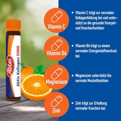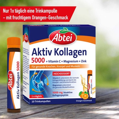 Im Alltag wird unser Bewegungsapparat stark gefordert. Zunehmendes Alter, Bewegungsmangel sowie einseitige Beanspruchung wirken als zusätzliche belastende Faktoren auf Knochen und Knorpel und somit auf unsere Gelenke ein.Die praktischen Trinkampullen Abtei Aktiv Kollagen 5000 enthalten eine wertvolle Kombination aus hochwertigen bioaktiven Kollagenpeptiden®, Vitamin C, B6, Magnesium, Zink und Silicium.
