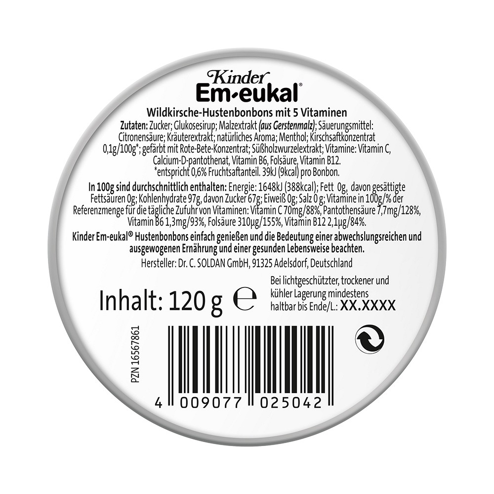 Wer kennt es nicht – das Kinder Em-eukal Bonbon mit dem typischen Wildkirschgeschmack? Das erste Vitamin-Husten­bonbon für Kinder überhaupt. Mit hochwertigen, natürlichen Zutaten und fünf sorgfältig ausgewählten Vitaminen.