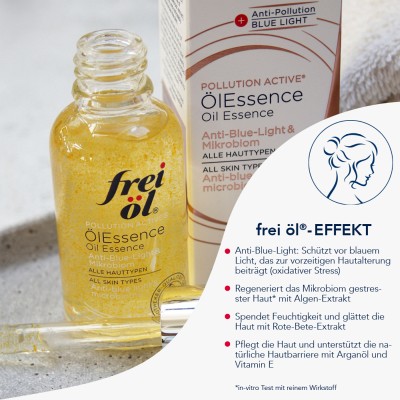 Die leichte frei öl® POLLUTION ACTIVE® ÖlEssence ist eine wirkungsvolle Pflege mit einer innovativen Formulierung, welche die Textur eines leichten Serums mit feinsten und hochpotenten Ölperlen vereint.Das Produkt kombiniert drei ultramoderne Extrakte: