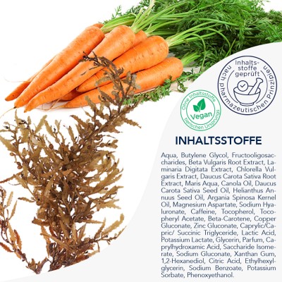 - Karotten-Extrakt, der das blaue Licht (z.B. als Teil des Sonnenlichts, Smartphones) blockiert, das durch Bildung freier Radikale oxidativen Stress in der Haut verursacht,