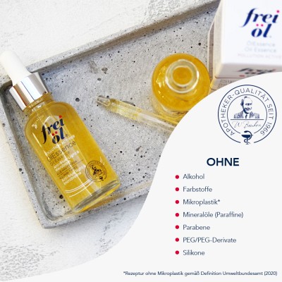 Durch die besondere Textur der frei öl® ÖlEssence werden die wertvollen Ölperlen auf der Haut in Verbindung mit den Wirkstoffen gebracht und damit aktiviert. Das leichte Produkt zieht sofort ein und pflegt spürbar. Gestresste Haut wirkt geglättet, praller und strahlender.