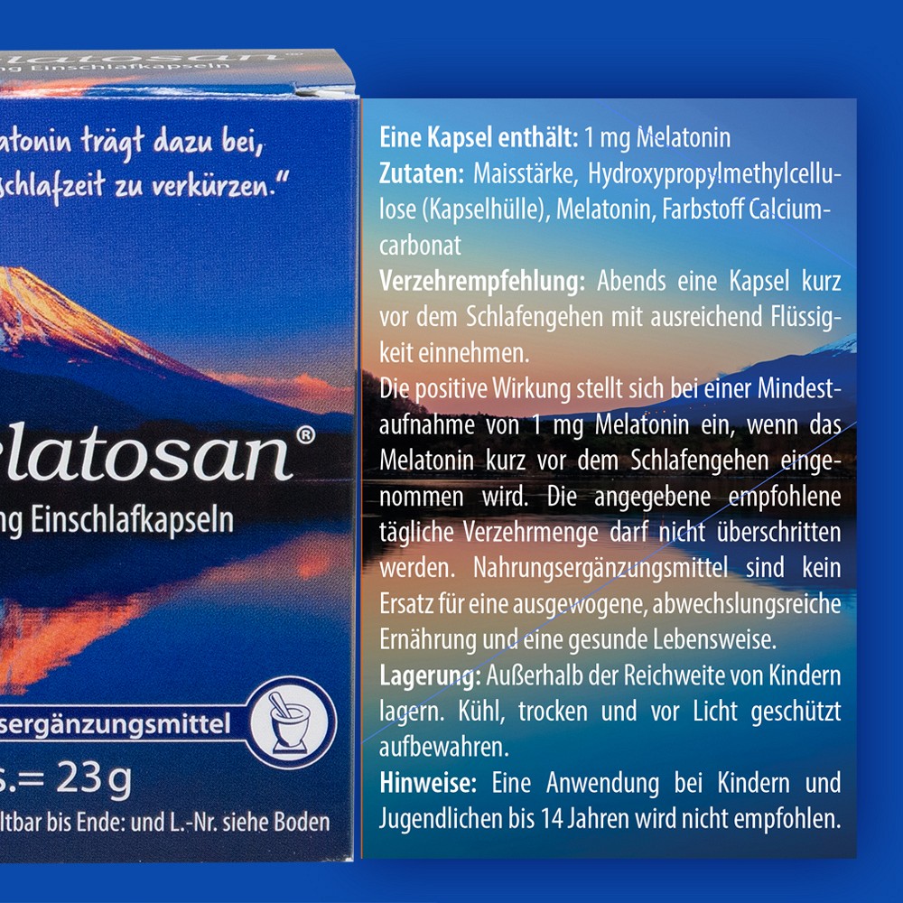 Melatosan® Einschlafkapseln mit 1 mg Melatonin tragen dazu bei, die Einschlafzeit zu verkürzen und unterstützen den natürlichen Schlaf-Wach-Rhythmus.