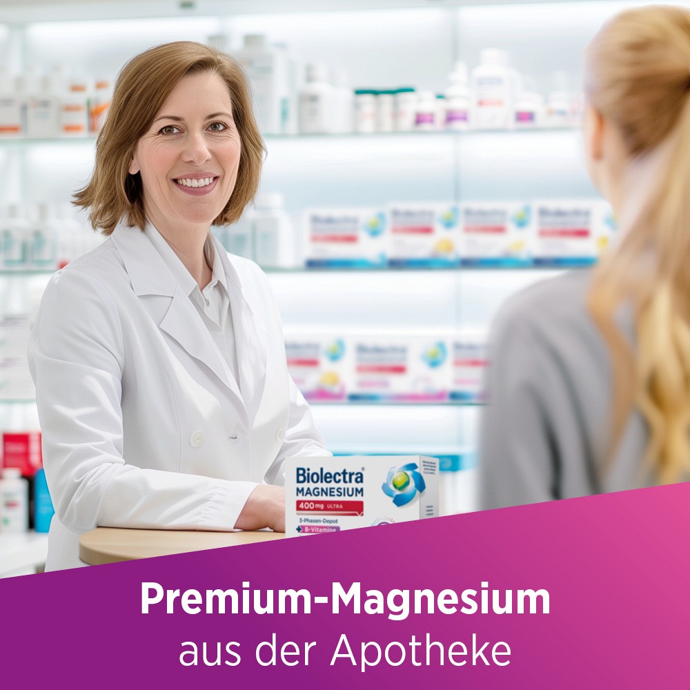 Der Tagesbedarf an Magnesium beträgt für Erwachsene ab 25 Jahre generell etwa 300 bis 350 Milligramm. Allerdings kann der Bedarf an Magnesium und B-Vitaminen in bestimmten Lebenssituationen erhöht sein, so dass eine hochdosierte Gabe sinnvoll sein kann. Besonders in Entwicklungs- und Wachstumsphasen braucht der Körper vermehrt Mineralien wie Magnesium. So haben z. B. Jugendliche, junge Erwachsene und Stillende einen erhöhten Magnesiumbedarf. Auch bei sportlich aktiven Menschen oder Personen, die mental stark beansprucht sind oder körperlich schwere Tätigkeiten ausüben, kann eine erhöhte Magnesiumzufuhr und eine Ergänzung von B-Vitaminen notwendig sein. Magnesium unterstützt dabei u.a. die normale Muskelfunktion. B-Vitamine tragen zu einer normalen Funktion des Nervensystems und Energiestoffwechsels bei und unterstützen damit ebenfalls die Muskeln, denn auch diese werden über das Nervensystem gesteuert. Zusätzlich zu Magnesium tragen die Vitamine B2, B6 und B12 außerdem, ebenfalls zur Verringerung von Müdigkeit und Erschöpfung bei. Schon eine Tablette des Biolectra® Magnesium 400 mg ultra 3-Phasen-Depots täglich versorgt den Körper mit Magnesium und B-Vitaminen. Dank der besonderen 3-Phasen-Technologie wird das Magnesium nach und nach über einen Zeitraum von mehreren Stunden freigesetzt und für die Aufnahme zur Verfügung gestellt.