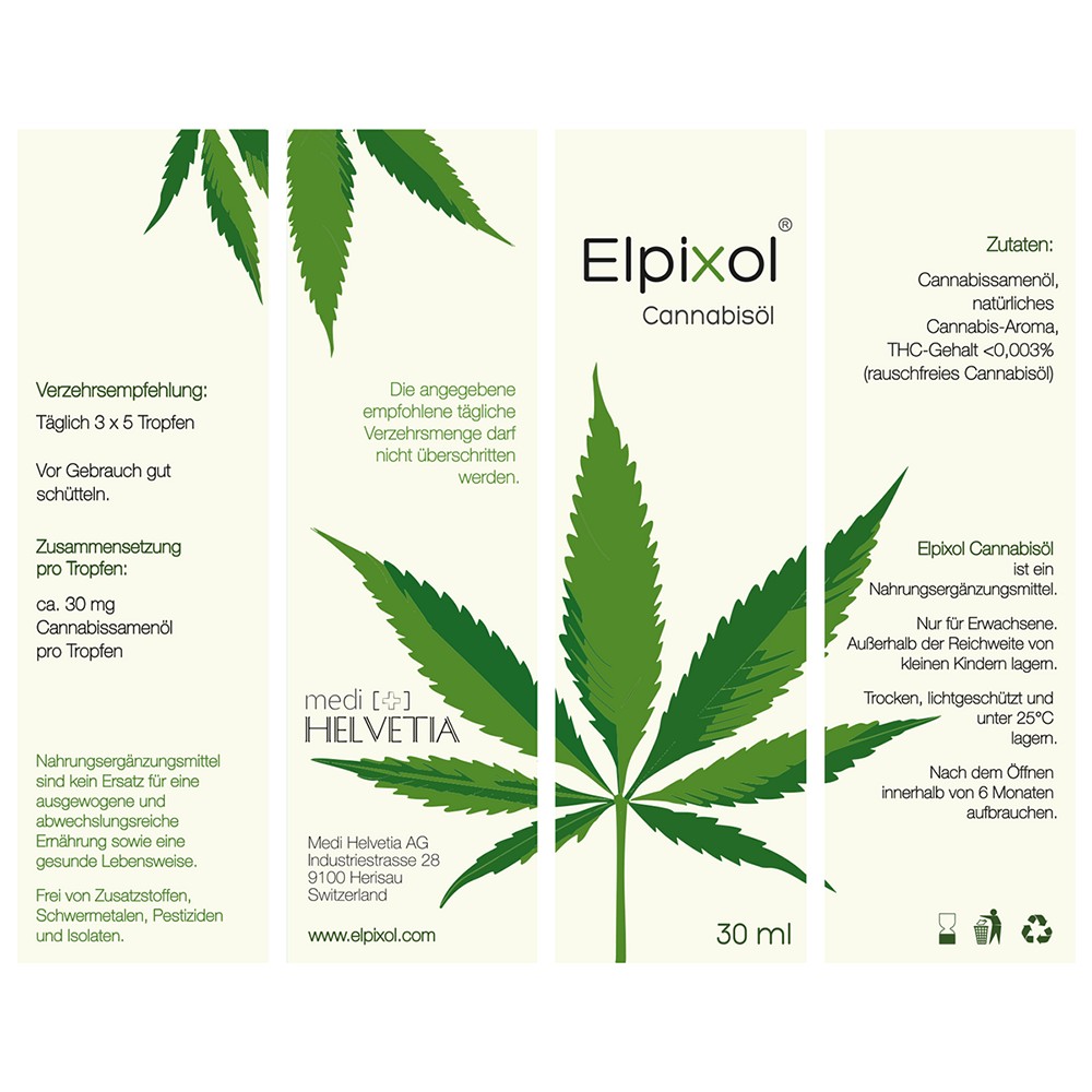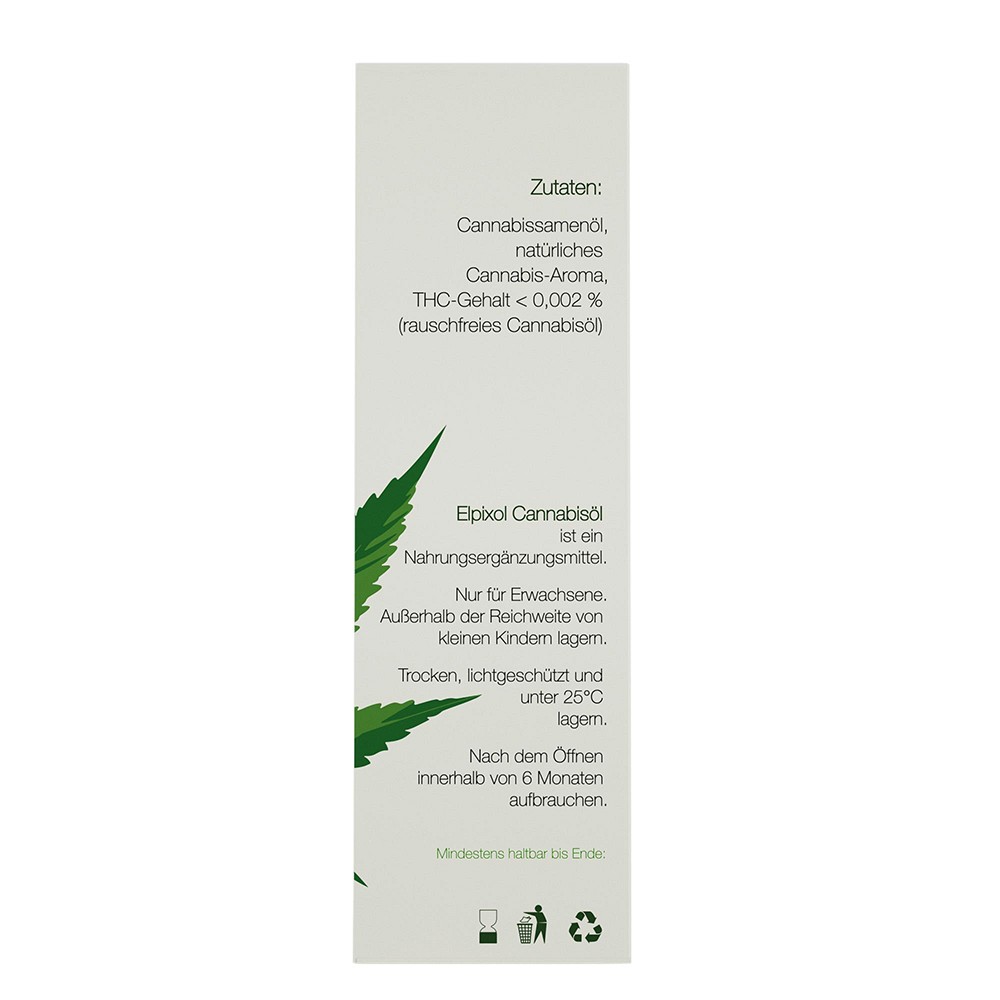 - Elpixol Cannabisöl darf nicht geraucht, vaporisiert, in der E-Zigarette verdampft oder gedabbt werden.